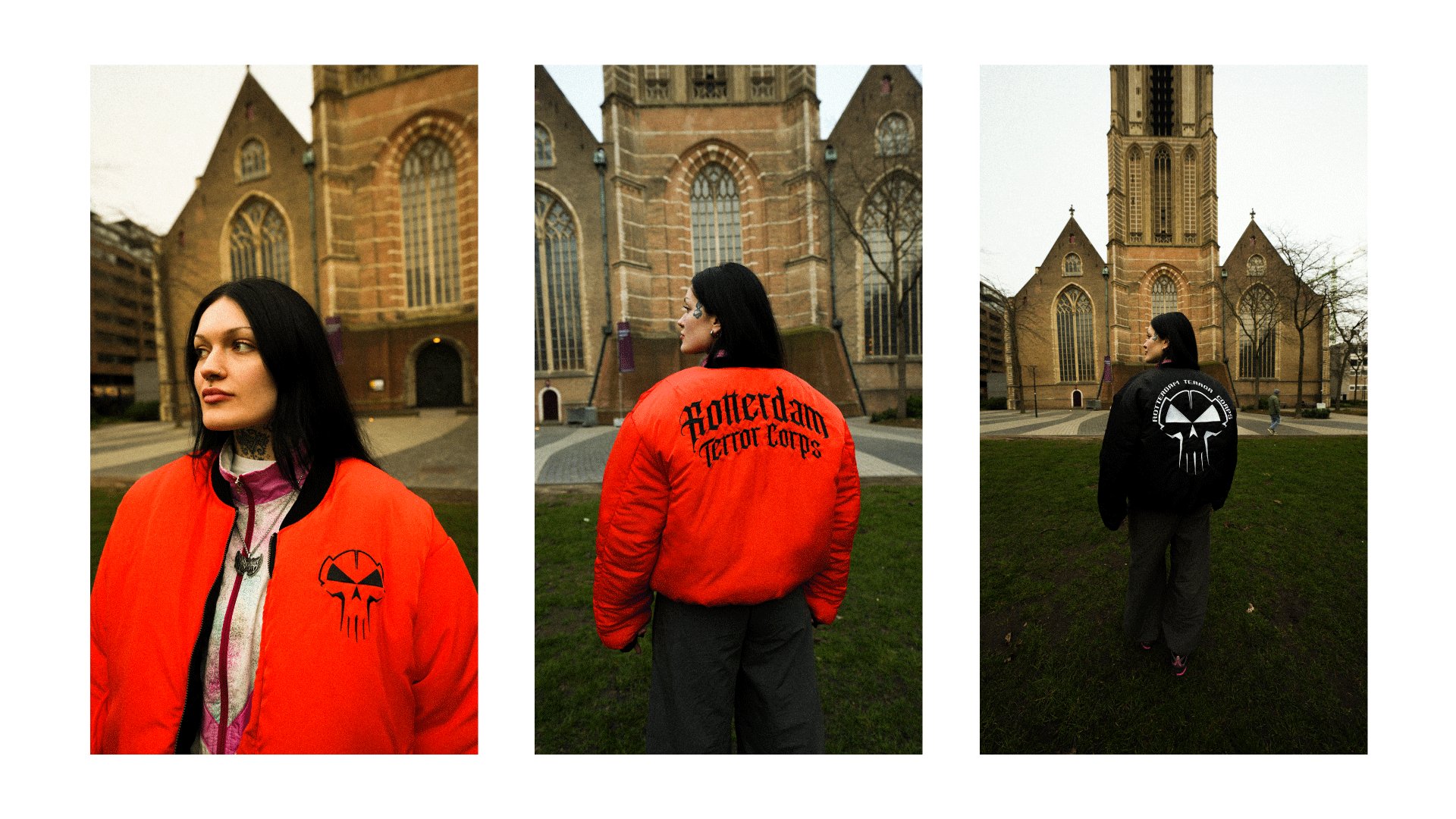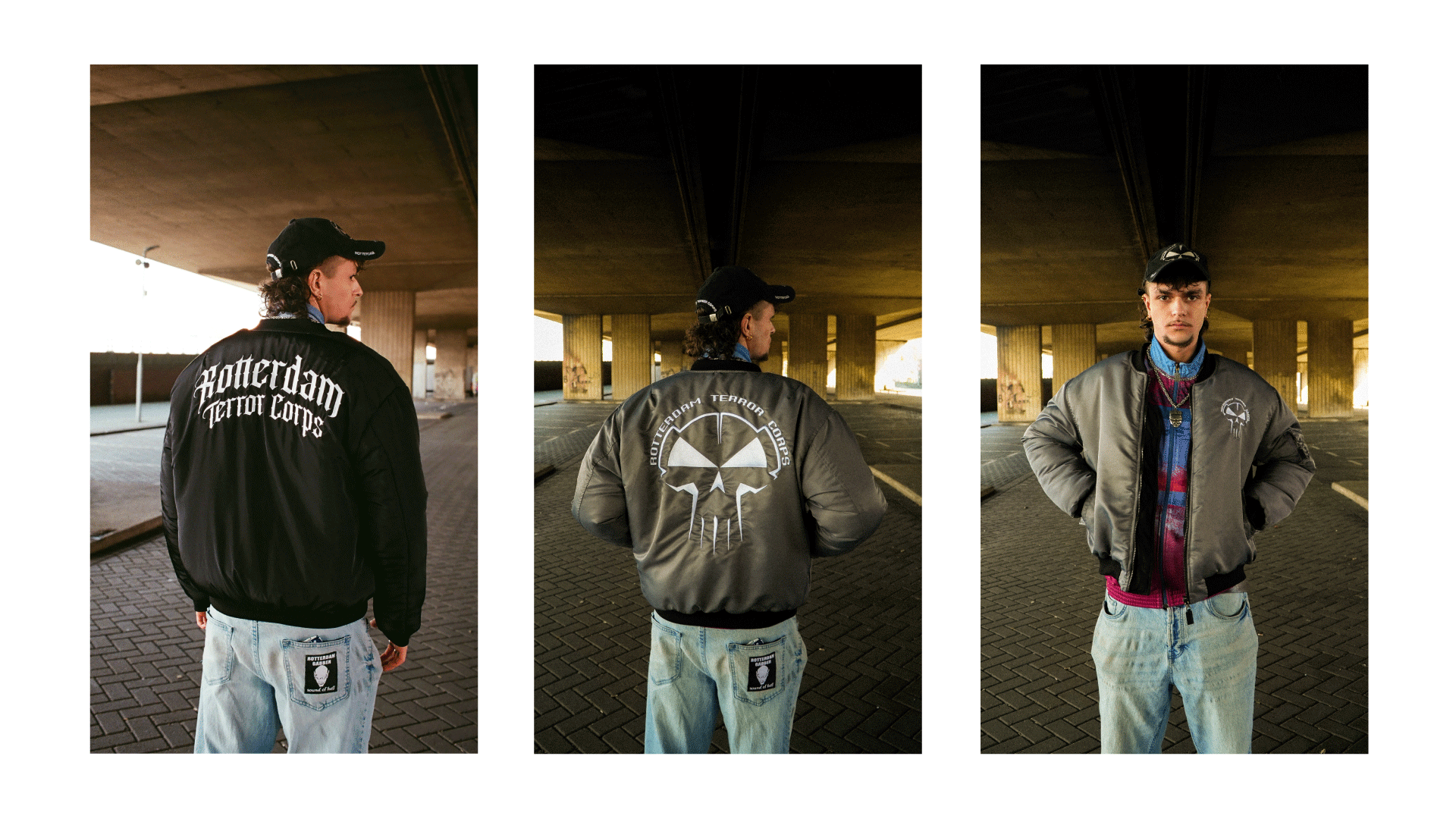 This project features a series of three reversible bomber jackets designed for the Dutch hardcore/gabber brand Rotterdam Terror Corps. Each jacket was developed with versatility in mind, offering two distinct styles in one piece. One side presents a bold, high-energy look, perfect for festivals or for those who want to make a strong statement, while the other side provides a more understated aesthetic for everyday wear.